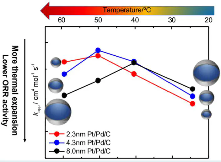 Image credit: UnsplashThe oxygen reduction reaction (ORR) activity and the coverage of oxide species over a Pd core–Pt shell catalyst on carbon support (Pt/Pd/C) with various Pd core sizes (2.3, 4.3, and 8.0 nm) were investigated in the temperature range from 25 to 60 °C and compared with a Pt/C catalyst (TEC10V30E, Tanaka Kikinzoku Kogyo). The apparent rate constant (kapp) of Pt/Pd/C increased with increasing core size at 25 °C. However, kapp of Pt/Pd/C started to decrease at 50–60 °C, while that of Pt/C behaved according to the general Arrhenius equation. Eventually, the 2.3 nm core showed the highest kapp at 60 °C, and the 8.0 nm core was almost the same as that of Pt/C. According to the electrochemical measurements, the coverage of oxide species on Pt/Pd/C was quite smaller than that of Pt/C. However, it increased dramatically with increasing temperature from 25 to 60 °C. Among the Pt/Pd/C, the 8.0 nm core showed the most obvious oxide coverage increase at 60 °C, which was almost identical to that of Pt/C. In contrast, the 2.3 nm core showed the lowest oxide coverage at 60 °C, which was expected to be the cause of the largest kapp. Operando X-ray absorption spectroscopy indicated that the Pt–Pt bond length in Pt/Pd/C was shorter than that in the Pt/C at 25 °C due to compressive surface strain from the Pd core, which is the reason why Pt/Pd/C has higher activity than Pt/C. On the other hand, as Pd has a thermal expansion coefficient higher than that of Pt, Pt/Pd/C showed a Pt–Pt bond length larger than that of Pt/C at 60 °C. A longer Pt–Pt bond length extension was observed at 60 °C in the 8.0 nm core compared to that in the other catalysts.