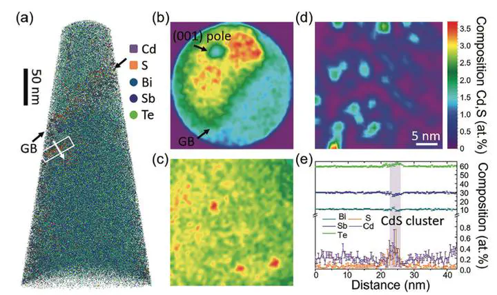 Image credit: UnsplashThe untapped potential of sub-nanometric materials (SNMs) in constructing high-performance thermoelectrics (TE) presents a promising yet unexplored avenue. This study investigates the utilization of supertetrahedral CdS clusters, representing SNMs, in conjunction with state-of-the-art Bi2Te3-based systems. The CdS cluster with size-dependent electronic structure enables selective interface scattering of carriers, while its 1 nm size and size-dependent phonon density of states (DOS) contribute to significant interfacial thermal resistance. Furthermore, interfacial dislocations and significant grain refinement induced by the incorporation of the CdS cluster boost the mechanical properties. Consequently, a remarkable peak figure of merit (ZT) value of 1.47 at 350 K and a record-high Vickers hardness of 1.08 GPa is achieved in the Bi0.5Sb1.5Te3/0.1 wt% CdS cluster composite. The robust TE module achieves an excellent conversion efficiency of about 6.1% under a ΔT of 241 K. This work opens up exciting possibilities for utilizing 1 nm clusters in thermoelectrics and even inspires other fields involving size-dependent electrical and thermal transport behaviors.