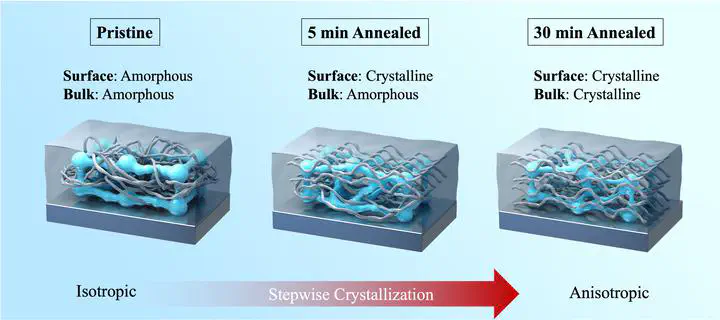 Image credit: UnsplashPt-supported SPEEK (sulfonated poly(ether ether ketone)) thin films, mimicking the ionomer–electrode interface in polymer electrolyte fuel cells (PEFCs), were synthesized with thicknesses from 12 to 105 nm. Their glass transition temperature (Tg) was analyzed via in situ thermal ellipsometry, revealing a thickness-dependent decrease in Tg, indicative of confinement effects. Particularly, a 30 nm film, typical of practical ionomer films, exhibited surface crystallization preceding that at the buried interface, a phenomenon linked to higher mobility at the free surface, as confirmed by grazing incidence wide-angle X-ray scattering (GIWAXS) at both subcritical (0.09°) and supercritical (0.14°) angles. This study elucidates the dynamic interplay between the high-mobility-free surface and the interaction-intensive buried interface in confined SPEEK thin films. It was observed that below 30 nm thickness, interfacial interactions become the primary factor influencing transition temperature. Additionally, spatially heterogeneous crystallization, more pronounced in the out-of-plane direction, correlates with reduced proton conduction, underscoring the impact of membrane electrolyte assembly (MEA) hot-pressing on the functional properties of Nafion alternatives..
